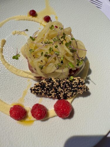 En mi caso, fuimos cinco y nos lanzamos al menú degustación de 3 platos, con copa de espumoso de bienvenida y agua servida con todo el arte. Fue una experiencia redonda, de esas que te dejan buen sabor de boca y mejor recuerdo. Nos encantó a todos, de todas las edades, y salimos flotando entre el paisaje, la comida y el momentazo de estar comiendo en un castillo con vistas de postal.