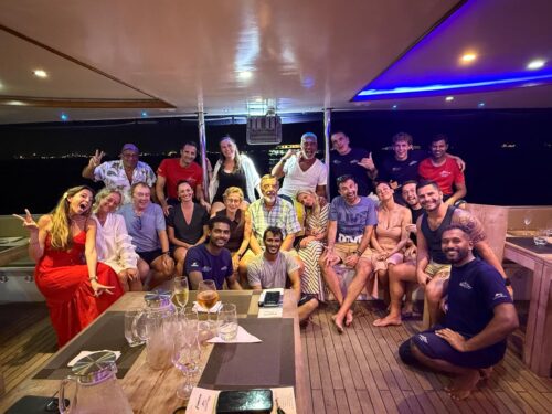 Por la tarde el ritmo baja todavía más. Última actividad en el agua, ducha salada, cerveza fría si te apetece y el cielo empezando a cambiar de color. La cena se alarga sin prisa, las conversaciones se vuelven más lentas y el barco queda fondeado en mitad de una laguna imposible. Sin ruido, sin luces, sin planes. Solo el sonido del agua contra el casco y un cielo lleno de estrellas. Así, día tras día, hasta que dejas de mirar el reloj y empiezas a medir el tiempo en azules.