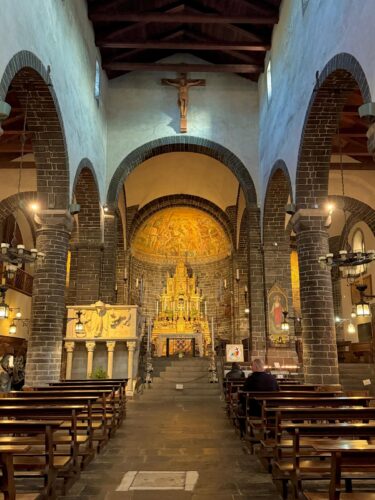 La Basílica de San Giacomo es el epicentro religioso y arquitectónico de Bellagio. Construida entre los siglos XII y XIV, combina elementos románicos y góticos que reflejan las distintas etapas de su historia, con una fachada sobria que contrasta con la riqueza de su interior. Cruzar sus puertas es como viajar en el tiempo: columnas antiguas, frescos que cuentan historias bíblicas y altares barrocos conviven en un espacio que ha sido testigo de generaciones de bellaghesi.