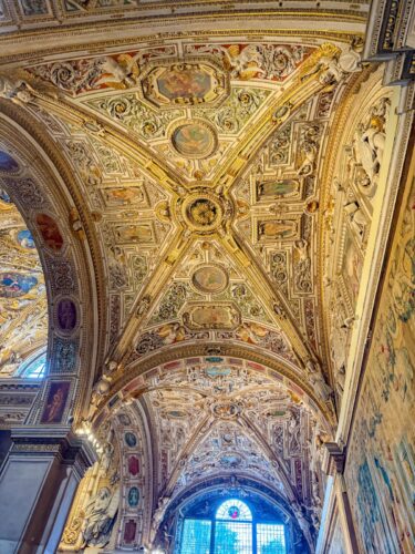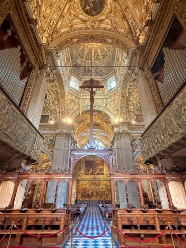 De todas las joyas de la Città Alta que ver en Bergamo, la Basílica de Santa Maria Maggiore es la que más sorprende. Desde fuera parece sobria, incluso discreta, porque su fachada principal quedó literalmente tapada por otros edificios (como la de Praga). Pero en cuanto cruzas la puerta… zasca. Frescos, tapices, estucos dorados y esculturas se combinan en un interior barroco que lo llena todo: es de esos templos en los que no sabes dónde mirar primero.