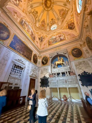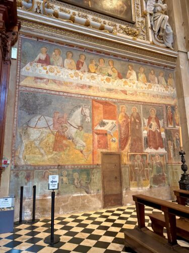 Dentro encontrarás la tumba monumental de Colleoni y la de su hija Medea, así como frescos atribuidos a Tiepolo y una decoración que no escatima en detalles. Pero ojo, que aquí viene el salseo: en la parte exterior hay un escudo con el blasón de los Colleoni, que muestra nada menos que tres testículos 😅. Sí, su apellido deriva de “coglioni”, y él lo convirtió en símbolo de fuerza y virilidad. Hoy en día, la tradición dice que tocar el relieve de los testículos trae buena suerte, así que ya sabes: si ves a turistas frotando la fachada, no es porque estén locos. Les están tocando los huevos literalmente.