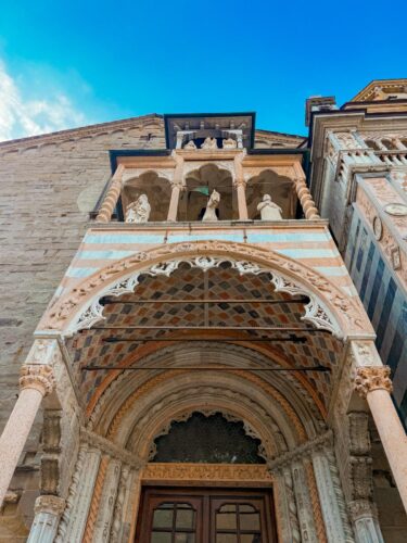 Maris mías, la Capilla Colleoni es un impepinable que ver en Bergamo y el vecino presumido de Santa Maria Maggiore. Mientras la basílica parece esconderse tras sus muros, la capilla es todo lo contrario: un derroche de mármol policromado en blanco, rojo y negro que brilla en plena Piazza Duomo.