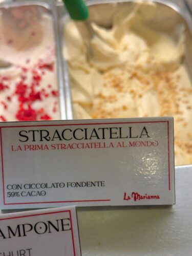 El invento nació en 1961 en La Marianna, una heladería histórica situada en Colle Aperto, justo en la entrada de la Città Alta. Su creador fue Enrico Panattoni, que se inspiró en una sopa romana del mismo nombre (stracciatella alla romana), en la que los huevos batidos se vierten en caldo caliente creando esos hilos irregulares que parecen “desgarrados”. Quiso replicar ese efecto en versión dulce: así que vertió chocolate caliente fundido sobre la base helada de nata. El resultado fue que el chocolate se solidificaba al instante en finas láminas que se rompían al remover… ¡y nació la stracciatella!