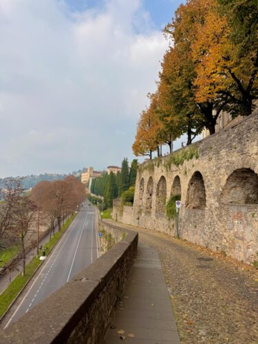 Y aunque estemos lejos de Venecia, las Murallas venecianas están en Bérgamo, son el paseo estrella de la ciudad y patrimonio de la UNESCO. Construidas en el siglo XVI por la República de Venecia para defender su joya lombarda, hoy en día no tienen nada de militar y todo de mirador panorámico. Son casi 6 kilómetros de muralla perfectamente conservada, que rodean toda la Città Alta y te regalan vistas brutales: por un lado, los tejados medievales y las torres; por el otro, la Città Bassa, los valles y, si el día está despejado, hasta los Alpes.