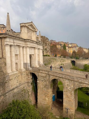 La Porta San Giacomo es probablemente la más fotogénica de las cuatro puertas monumentales que ver en Bérgamo. Construida en el siglo XVI en un impecable mármol blanco rosado, era la entrada “de gala” a la Città Alta desde la dirección de Milán. Hoy en día, más que puerta defensiva, parece un arco triunfal que enmarca unas vistas espectaculares: desde aquí ves la Città Bassa extendiéndose hasta los valles, y si el día acompaña, incluso los perfiles de los Alpes.
