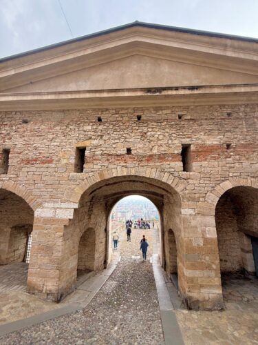 Lo curioso es que nunca cumplió su función bélica. Como el resto de las murallas, Porta San Giacomo jamás vio una batalla real; su papel acabó siendo más simbólico que defensivo, marcando la diferencia entre la ciudad medieval y la parte baja moderna. Ahora es uno de los accesos más transitados a pie, sobre todo por quienes prefieren bajar andando en lugar de tomar el funicular. Si tienes que elegir un punto para ver el atardecer en Bérgamo, este es el sitio: la luz dorada bañando las murallas y el mármol de la puerta es simplemente brutal..